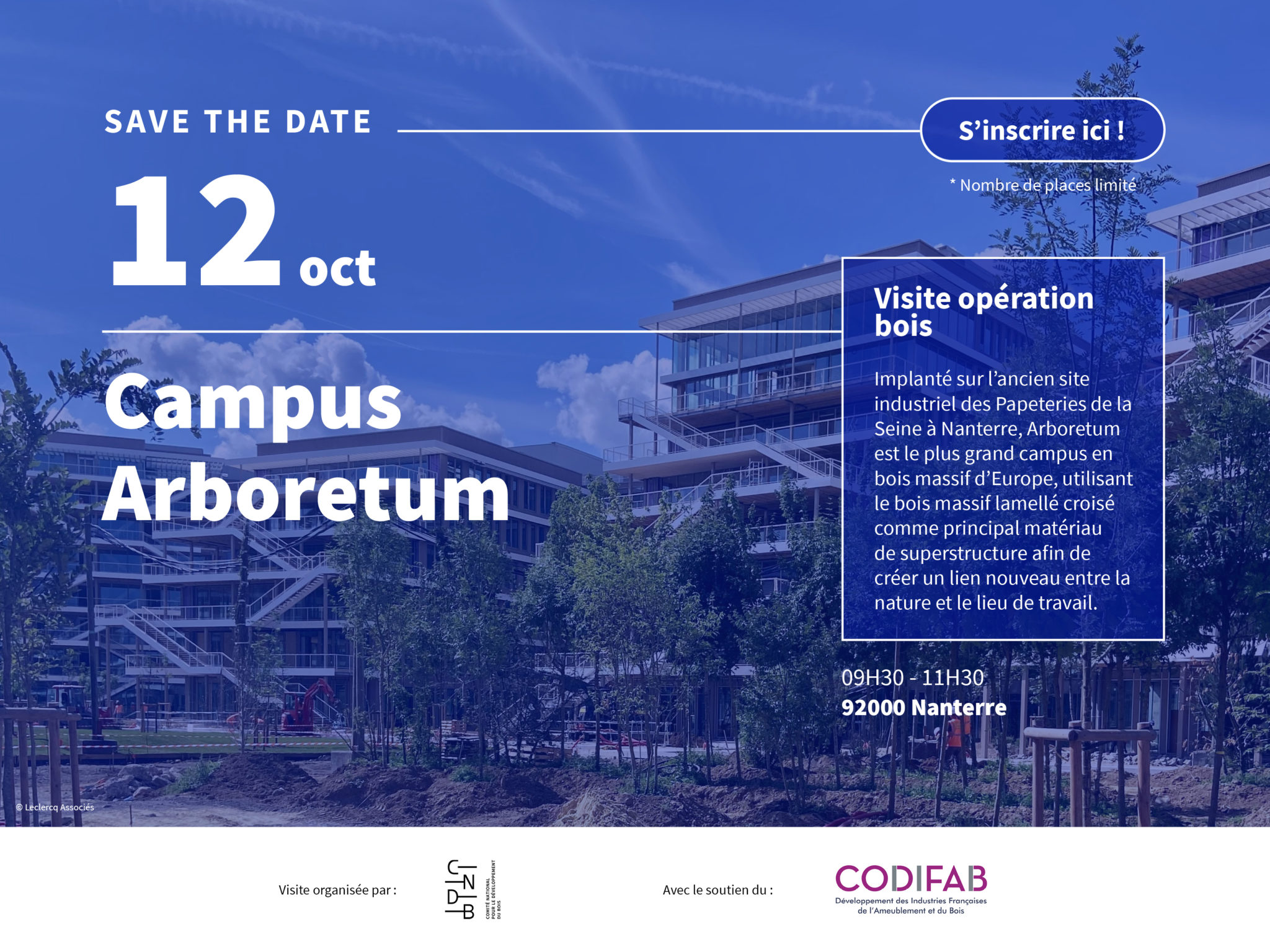Le CNDB, avec le soutien du CODIFAB, vous donne rendez-vous à Nanterre le jeudi 12 octobre de 9h30 à 11h30 pour la visite du Campus Arboretum, aussi appelé « La Ville Forêt » ; en présence des acteurs de l’opération.