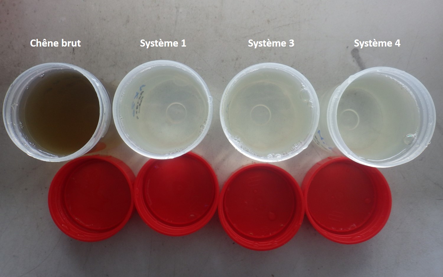 Le test d’immersion dans l’eau durant 72 heures s’est montré très pertinent pour estimer si des extractibles colorés du bois migrent à travers le système de finition. Comme attendu, le chêne brut (témoin) a généré une forte coloration des jus. Au contraire, les 3 systèmes de finition sur chêne (système 1, 3 et 4) n’ont pas présenté de coloration des jus qui étaient transparents. Ces systèmes ont donc bloqué efficacement de potentielles remontées d’extractibles colorés du bois.
