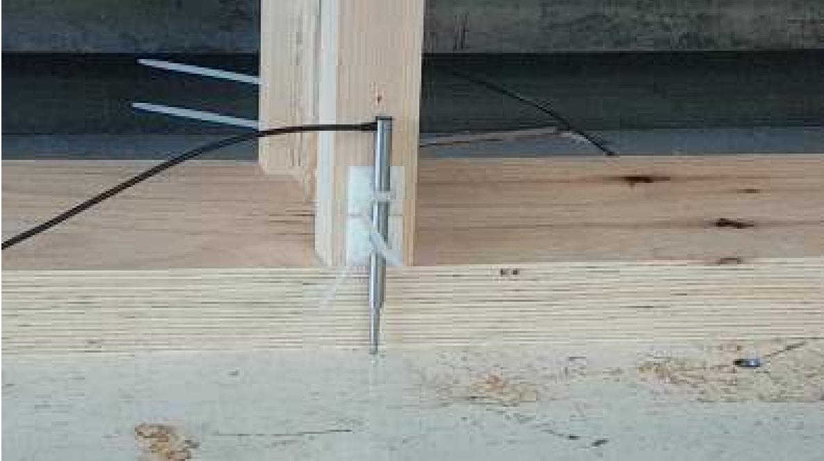 Les essais de compression transversale de traverse ont permis de s’assurer du bon comportement sous montant poutre en I avec chargement centré et excentré. Les différentes courbes d’essais effort/déplacement montrent que les valeurs de résistance caractéristiques déterminées par calcul conformément à l’Eurocode 5 correspondent à une déformation de la traverse demeurant dans le domaine élastique ou entrant légèrement en plastification dans le cas du chargement centré.