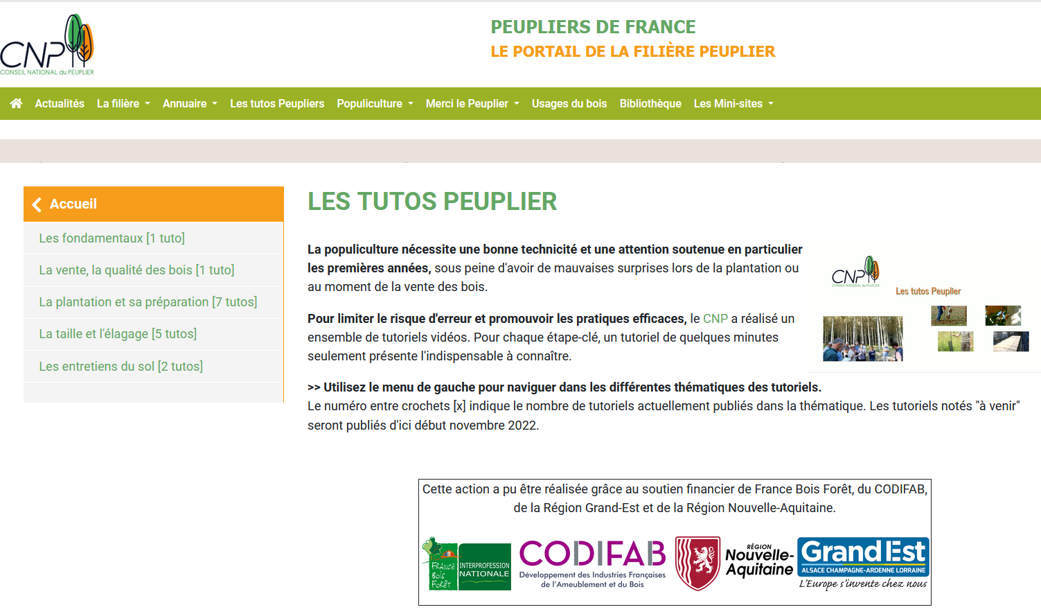 La populiculture nécessite une bonne technicité et une attention soutenue en particulier les premières années, sous peine d'avoir de mauvaises surprises lors de la plantation ou au moment de la vente des bois. Pour limiter le risque d'erreur et promouvoir les pratiques efficaces, le CNP a réalisé un ensemble de tutoriels vidéo. Pour chaque étape-clé, un tutoriel de quelques minutes seulement présente l'indispensable à connaître.