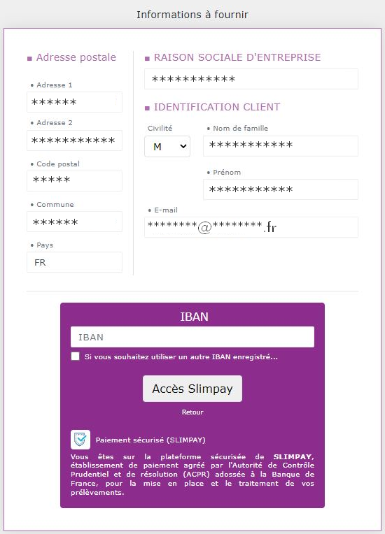 Lors d’un premier paiement en ligne, une page s’ouvre pour vous permettre de créer votre mandat de prélèvement (géré par Slimpay, Etablissement de Paiement agréé et respectant les normes SEPA).